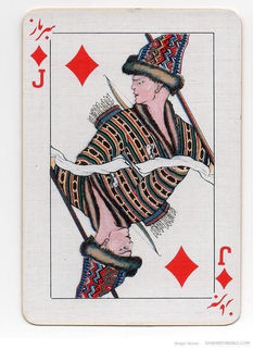 The deck below was designed by V. Romanowski de Boncza for the Royal Iranian Government Playing Card Monopoly (Ministry of Finance), and was created for the Persian market and reflects Iran’s rich cultural history. Printed by De la Rue & Co., Ltd. around 1937, the double-ended court cards feature figures dressed in traditional costumes from various Persian dynasties.